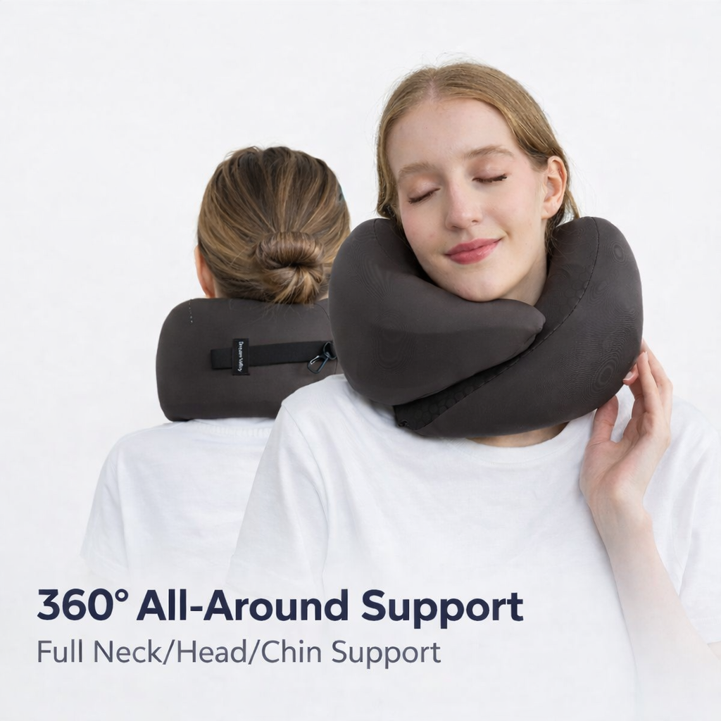 Traveling shouldn't mean sacrificing quality rest. This upgraded Dream Valley Outlast® Cooling Travel Pillow transforms how you sleep on the go—making rest cooler, easier, and more supportive. Designed with a patented ergonomic shape, it delivers 360° premium support in a lightweight, portable memory form. Outlast® technology actively absorbs excess heat and reduces sweat, keeping you cool and comfortable on long flights, road trips, or office breaks. The adjustable front closure lets you customize the fit to your preference. Rolls up compact and clips to your luggage with a built-in strap—ready whenever you need it.